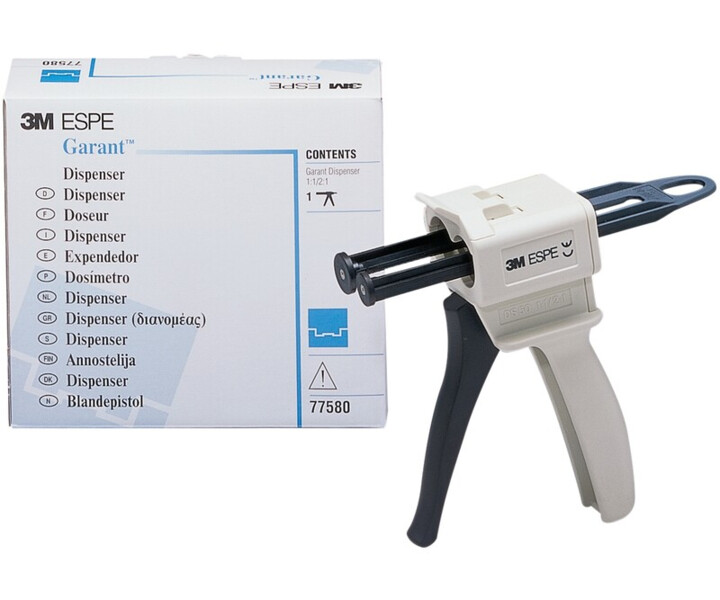 Der Garant Dispenser 1:1 / 2:1 ermöglicht blasenfreies Anmischen und direkte intra-orale Applikation von 3M / Solventum VPS und Polyether Abformmaterialien.
